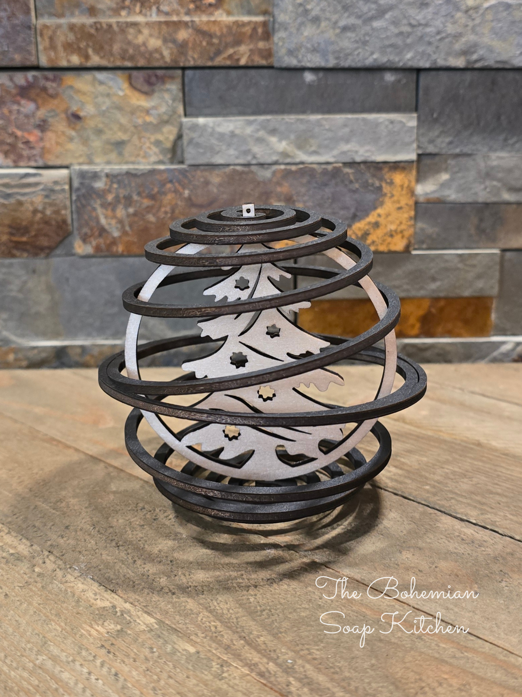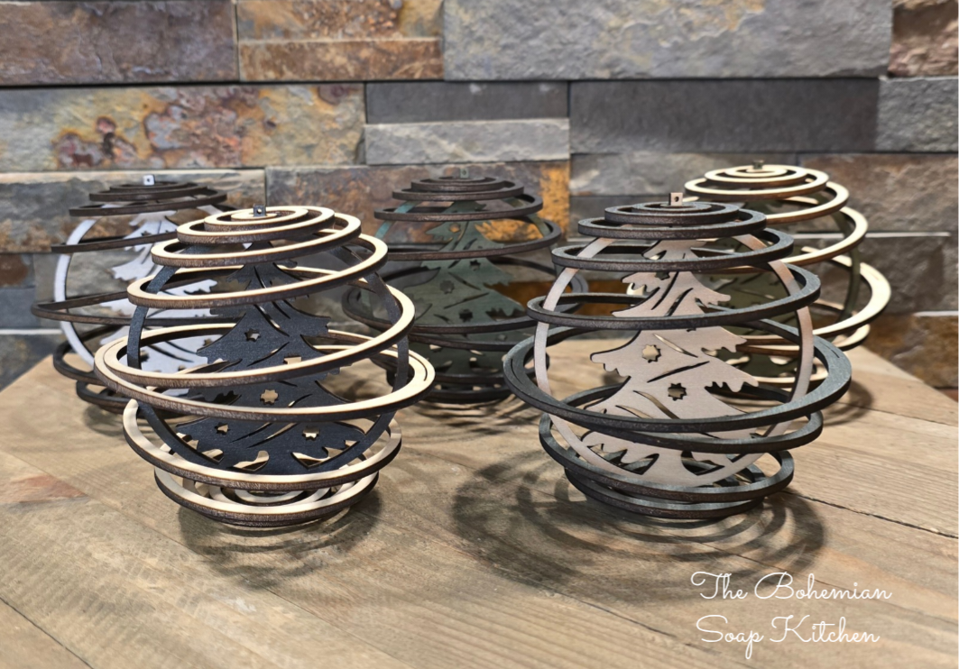 These Spiral Shaggy Christmas Tree ornaments are laser cut from basswood and hand painted with metallic acrylic paint. Each ornament measures 4" in height and 4.25" in width, and is delivered unassembled.