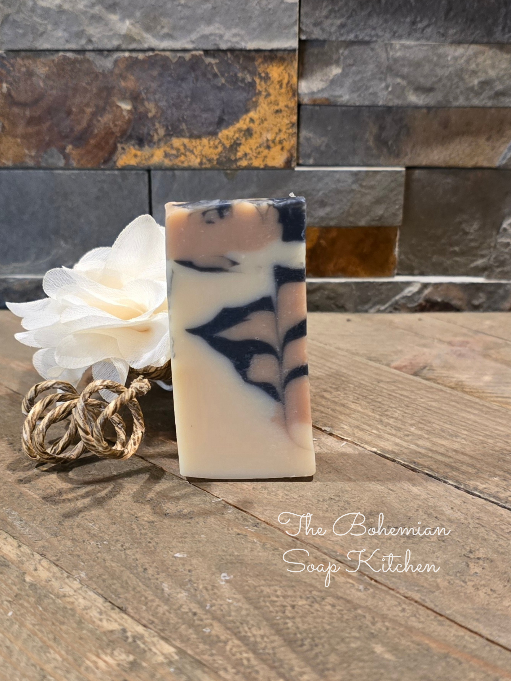 We made this bar with Patchouli essential oil, Orange essential oil, fresh goat milk, olive oil, coconut oil, cocoa butter, avocado oil, sweet almond oil, and castor oil. Naturally colored with red Moroccan clay, activated charcoal, and orange essential oil. Salt and citric acid are added to increase lather and decrease soap scum.